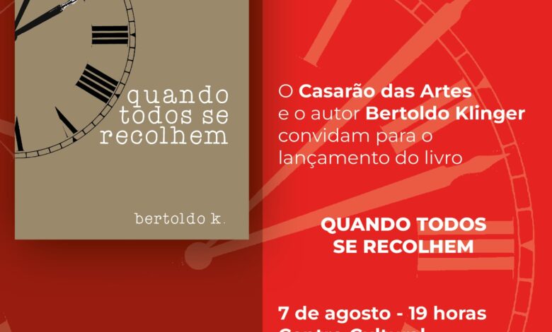 Na quinta-feira, 07 de agosto, às 19 horas, no Centro Cultural Casarão das Artes, localizado na Rua João Pinheiro, 154, centro de Caratinga, estará acontecendo o lançamento do livro “Quando Todos se Recolhem”, de autoria do caratinguense Bertoldo Klinger.